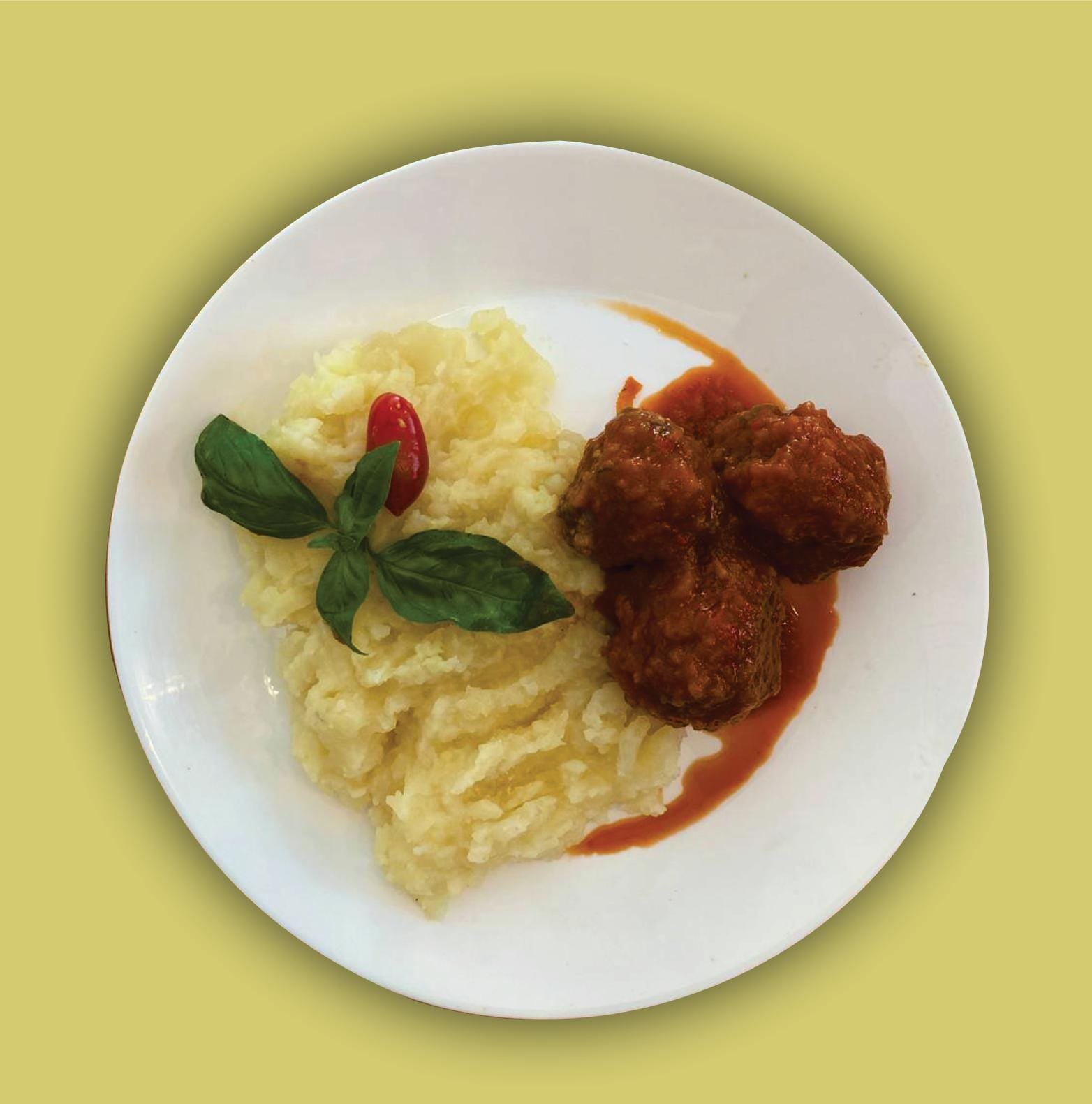Albóndiga de carne picada vacuna con salsa fileto y puré de papas