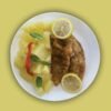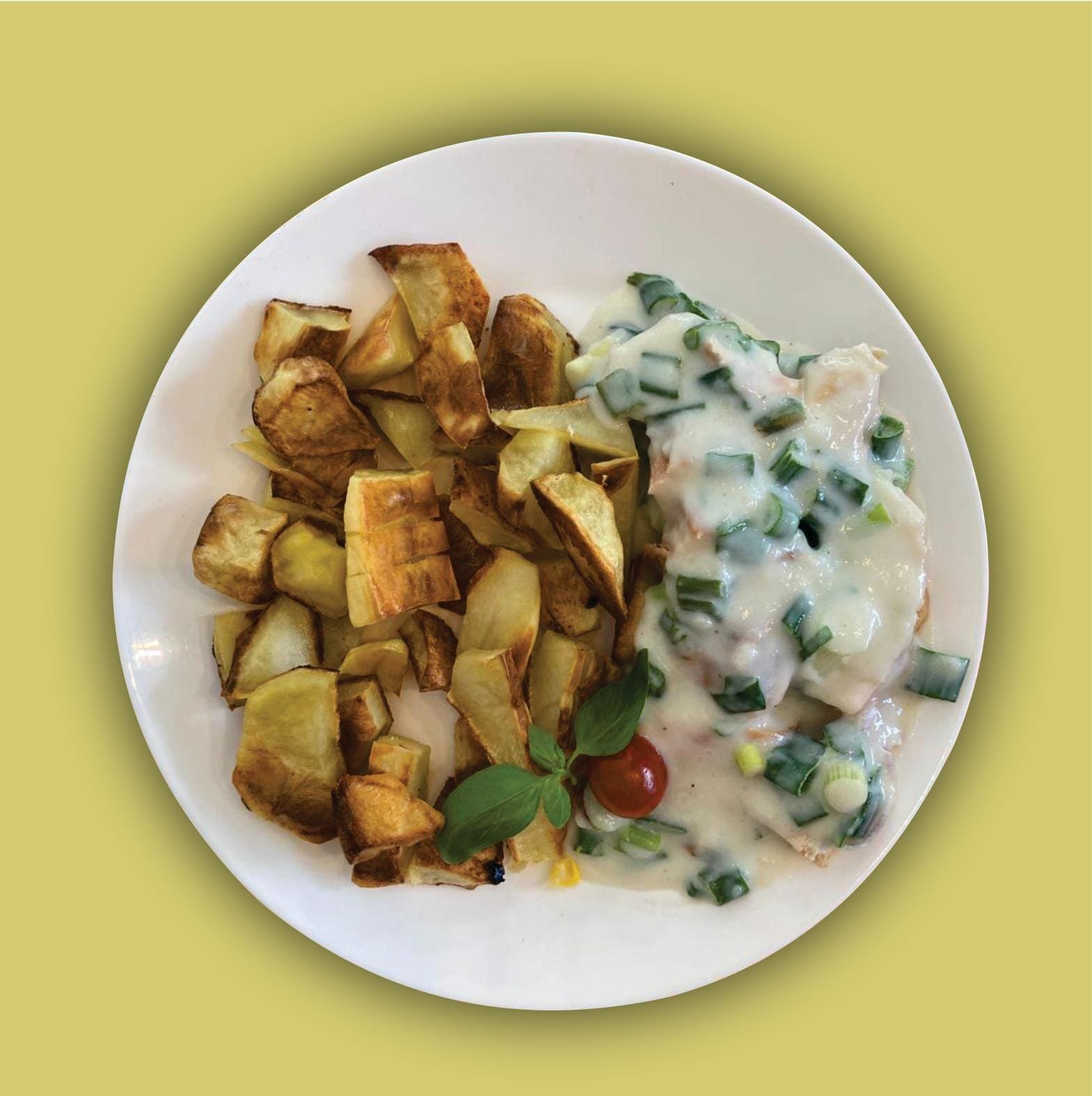 Lonjas de pollo al horno, con salsa crema de verdeo y papas al horno