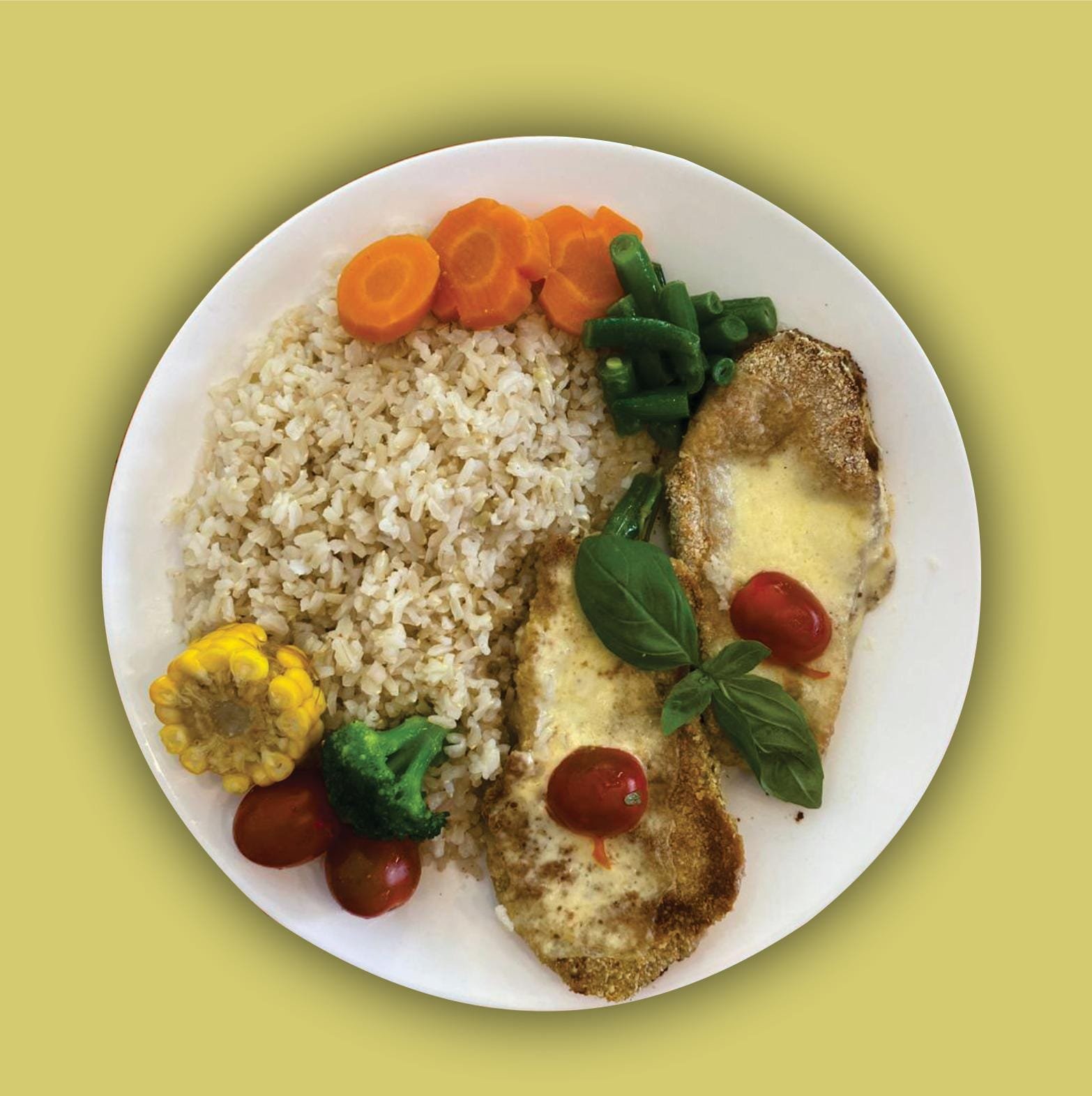 Lonja de berenjena empanada, con rodaja de tomate, queso ,con base arroz integral, cherry y decoración
