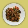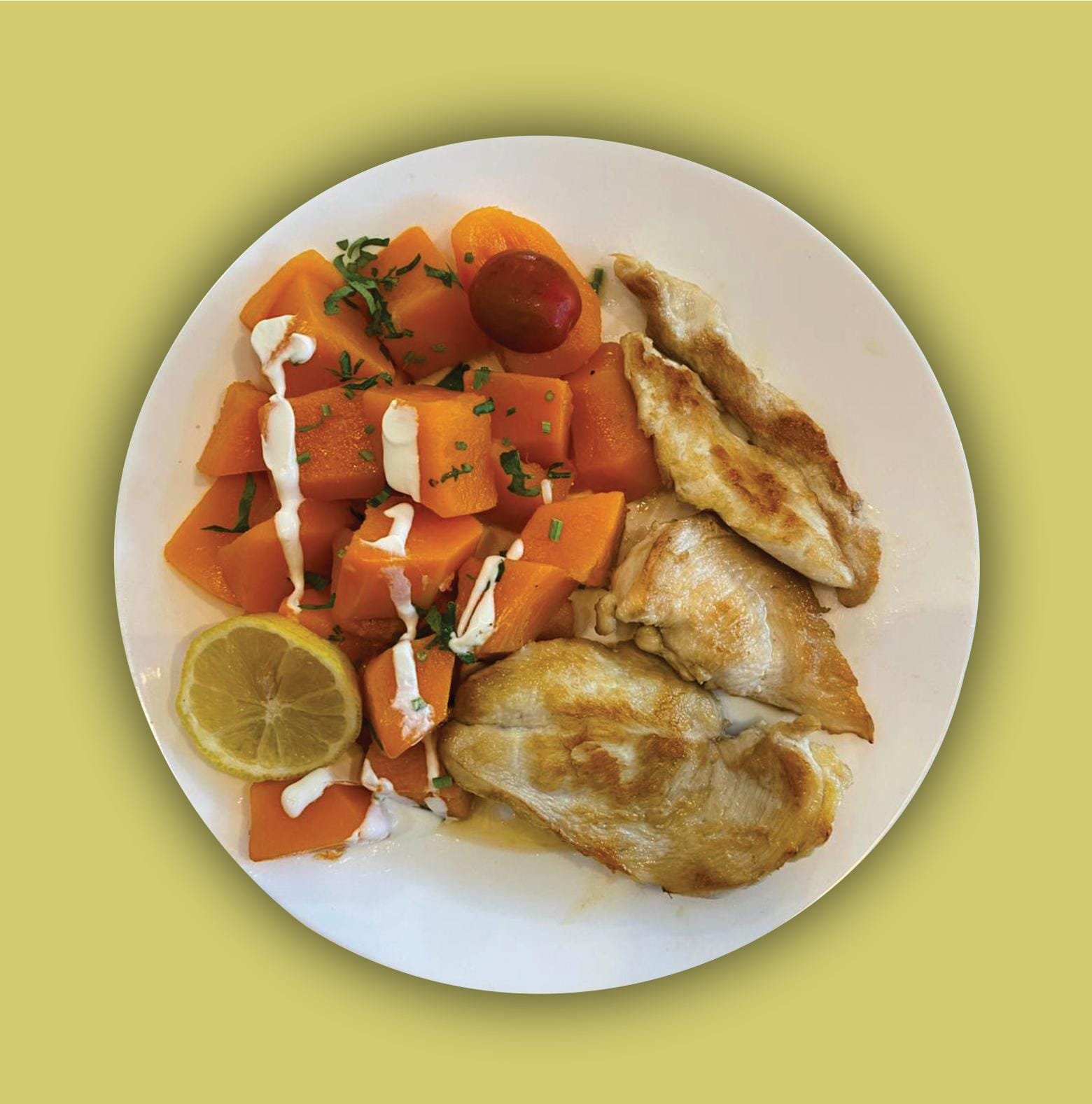 Pollo a la plancha acompañado de cubos de calabaza con cebollas caramelizadas