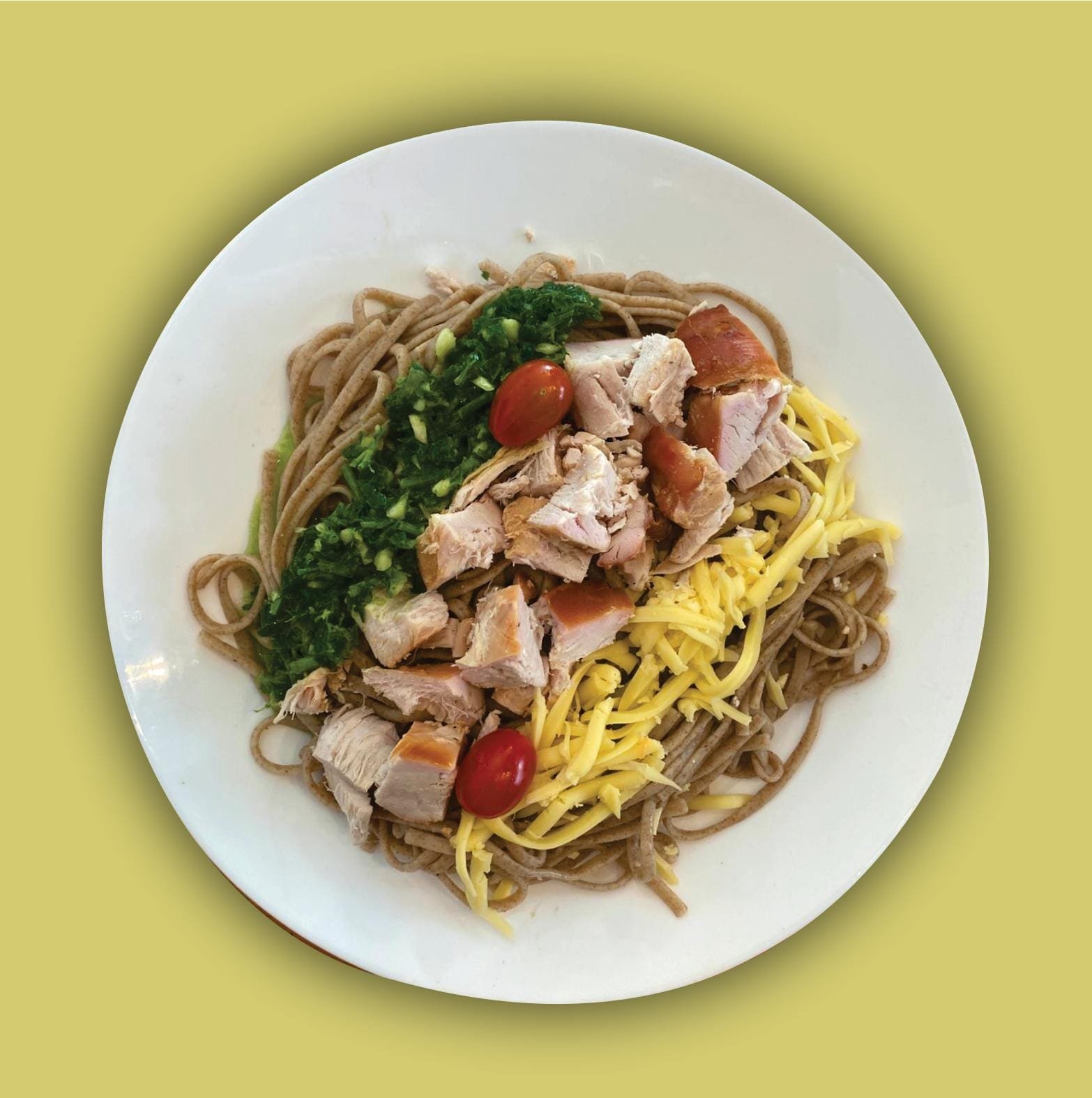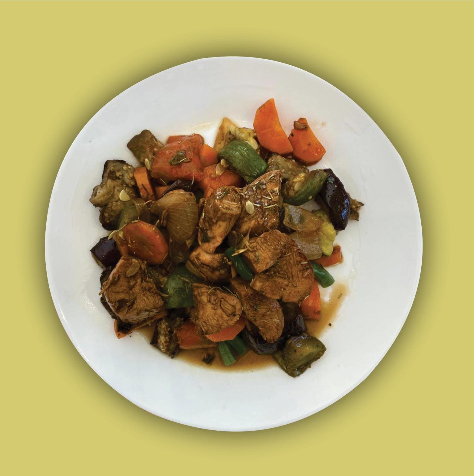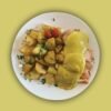 Base de papas al horno, con lonjas de pollo a la plancha con salsa mostaza