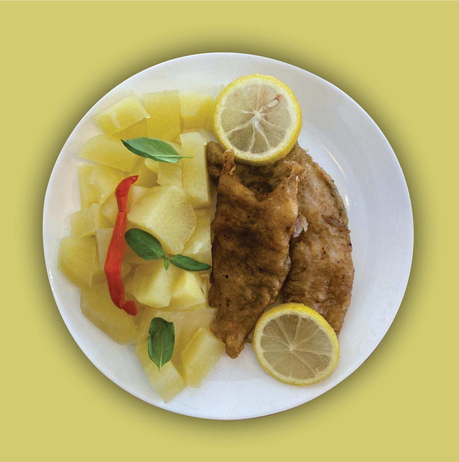Merluza a la romana, con base de papas al natural