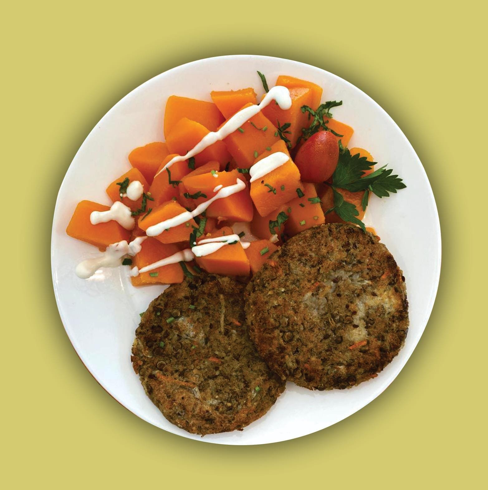 Hamburguesa de lentejas con cubos de calabaza